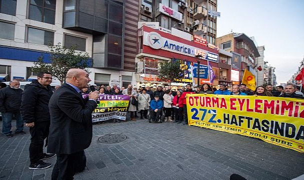 İzmir Büyükşehir Belediye Başkanı Tunç Soyer, Kamu Emekçileri Sendikaları Konfederasyonu (KESK) İzmir Şubeler Platformu’nun kamudan ihraç edilen personelin görevlerine iade edilmesi için başlattığı oturma eylemine katıldı. Kanun Hükmünde Kararnamelerle (KHK) görevlerinden ihraç edilen akademisyenler ile öğretmenlerin yanı sıra Barış Bildirisi’ne imza atan akademisyenler için her hafta Çarşamba günleri yapılan buluşmanın 272’ncisine destek veren Başkan Soyer, “Asla yalnız değilsiniz” dedi. Karşıyaka’da Çarşı girişinde yapılan eylemde, “Hak, hukuk, adalet”, “Asla yalnız yürümeyeceksin”, “Susmuyoruz, korkmuyoruz, itaat etmiyoruz”, “Kurtuluş yok tek başına, ya hep beraber ya hiçbirimiz” sloganları atıldı.